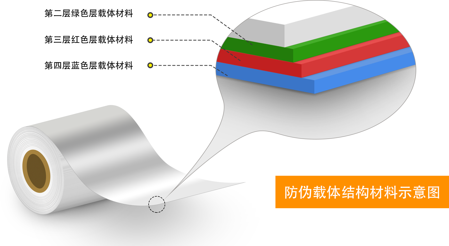 在一種包含多個顏色層的防偽結構的材料上,將真跡結構防偽元素及信息集合用物理方式隨機雕琢于不同的顏色疊層,使之不同部位呈現不同深淺和不同顏色的結構特征,所形成的結構組合圖案,是唯一的、不可復制的,具有難以復現的特點。在入口處為產品鑄就了一道天然的屏障,真正實現產品窗口準入。