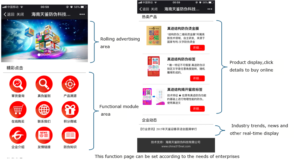 The authenticity could be checked by scanning the mobile phone, and the advertisement could be saw in the background interface, which realize the mobile marketing. The marketing platform has a large amount of exchange resources, high quality and rich content. Including more than 2,000 kinds of prizes such as card coupons, WeChat red envelopes, traffic, phone bills, and physical prizes, and updating the online exchange products from time to time, it is closer to the distance between consumers and consumers.