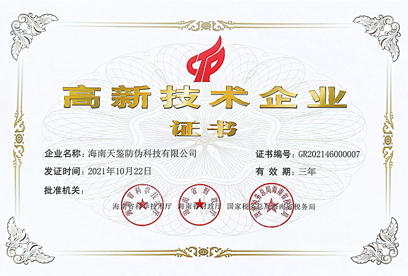 海南天鑒防偽科技有限公司(以下簡稱“海南天鑒”)成立于2006年02月,坐落于海南省海口市國家高新技術產業開發區,是一家提供專業的防偽與竄貨智能預警、產品溯源與精準營銷服務,以及多級經銷商管理系統的國家級高新技術企業。